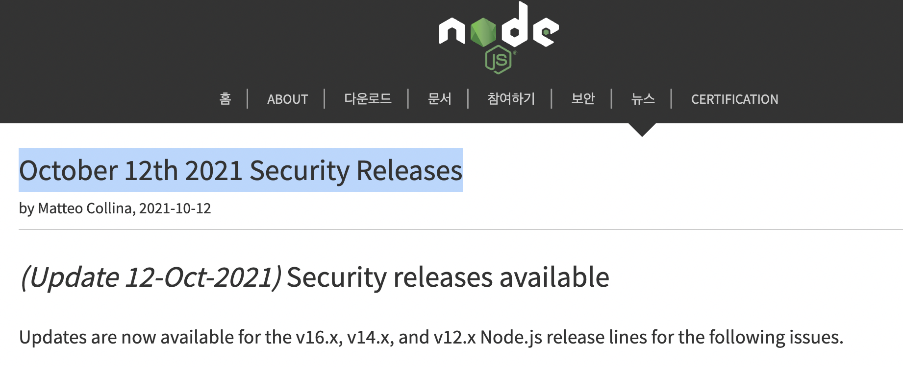 ㄴ nodejs 뉴스 탭 -> Security Releases 검색 -> Downloads and release details