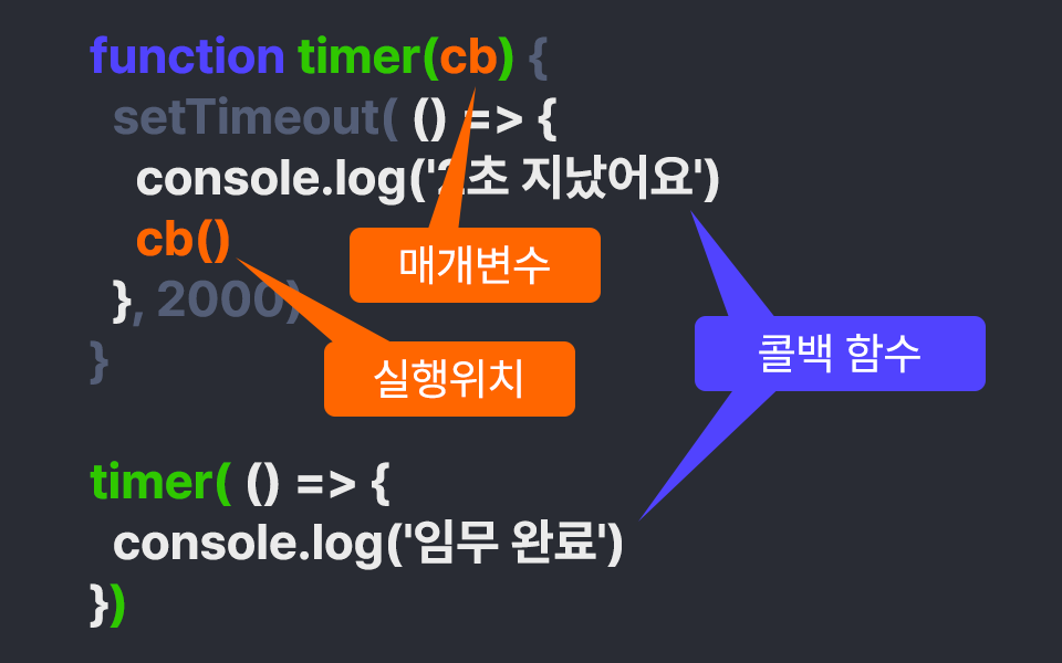 기명함수timer를 만들고 매개변수cb를 할당한 뒤 호출시키고 싶은 위치에서 실행cb( )한다.