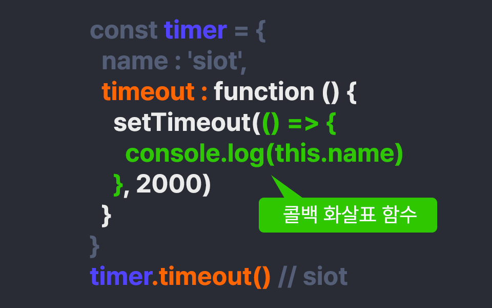 콜백함수로 화살표 함수를 할당하게 되면 그 자체에서 this가 정의되기 때문에 제대로 동작된다. 대표적으로 setTimeout과 같이 콜백을 인수로 쓰는 형태에서는 화살표 함수를 쓸 경우 this를 사용할 수 있게 된다.
