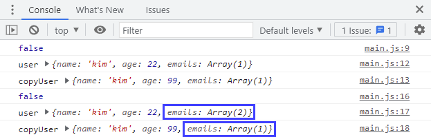 변수 user안에 배열데이터 emails는 복사되지 않는다. 껍데기만 복사되고 내부 내용(가변)은 참조되는 상황 발생