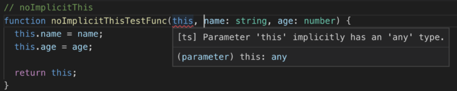 ◽ 첫 번째 매개변수에 this가 올 때, this에 타입을 명시하지 않으면 nolmplicitAny가 에러 발생