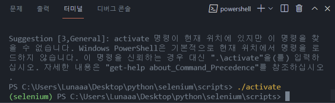selenium폴더 안에 scripts로 이동하여 activate(활성화)해주면