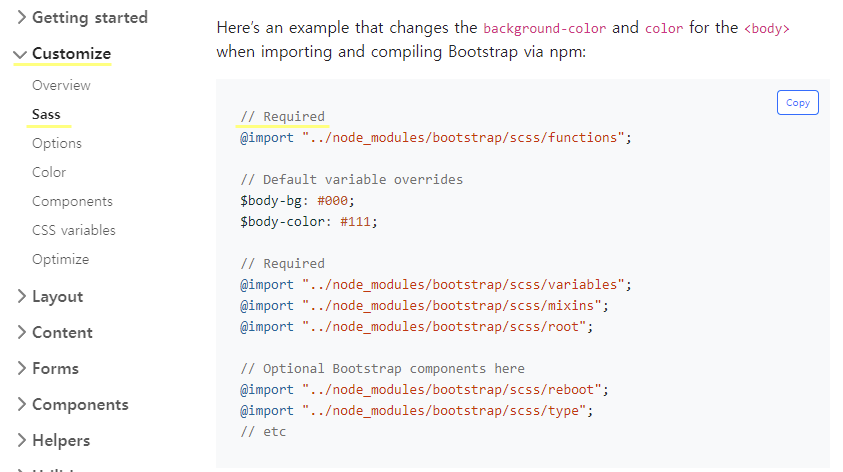 customizing할 때 필수적으로 import할 경로를 최상단에 놓아야 한다. variables에서 데이터를 가져와 $theme-colors에서 덮어스기 override되는 순서다.