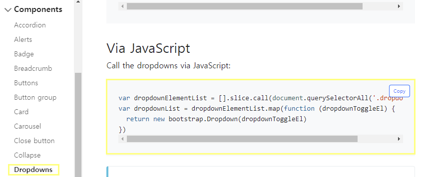 Components > dropdown > via javascript 소스코드를 js에 복붙하여 초기화과정 필요