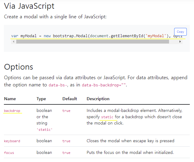 이 과정에서 모달은 옵션추가도 가능한데 backdrop: 'static'옵션은 바깥부분을 클릭해도 창이 꺼지지 않게 하는 옵션이다.
